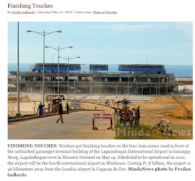 The Laguindingan Int’l Airport will primarily replace the existing Lumbia Airport in Cagayan de Oro, but is also expected to replace Balo-i Airport in in Ditucalan, Lanao del Norte. It is a flagship project of the Cagayan de Oro-Iligan Corridor special development project, which covers both the cities of Iligan and Cagayan de Oro, as well as five coastal towns in Lanao del Norte and the 14 towns of Misamis Oriental’s first congressional district.